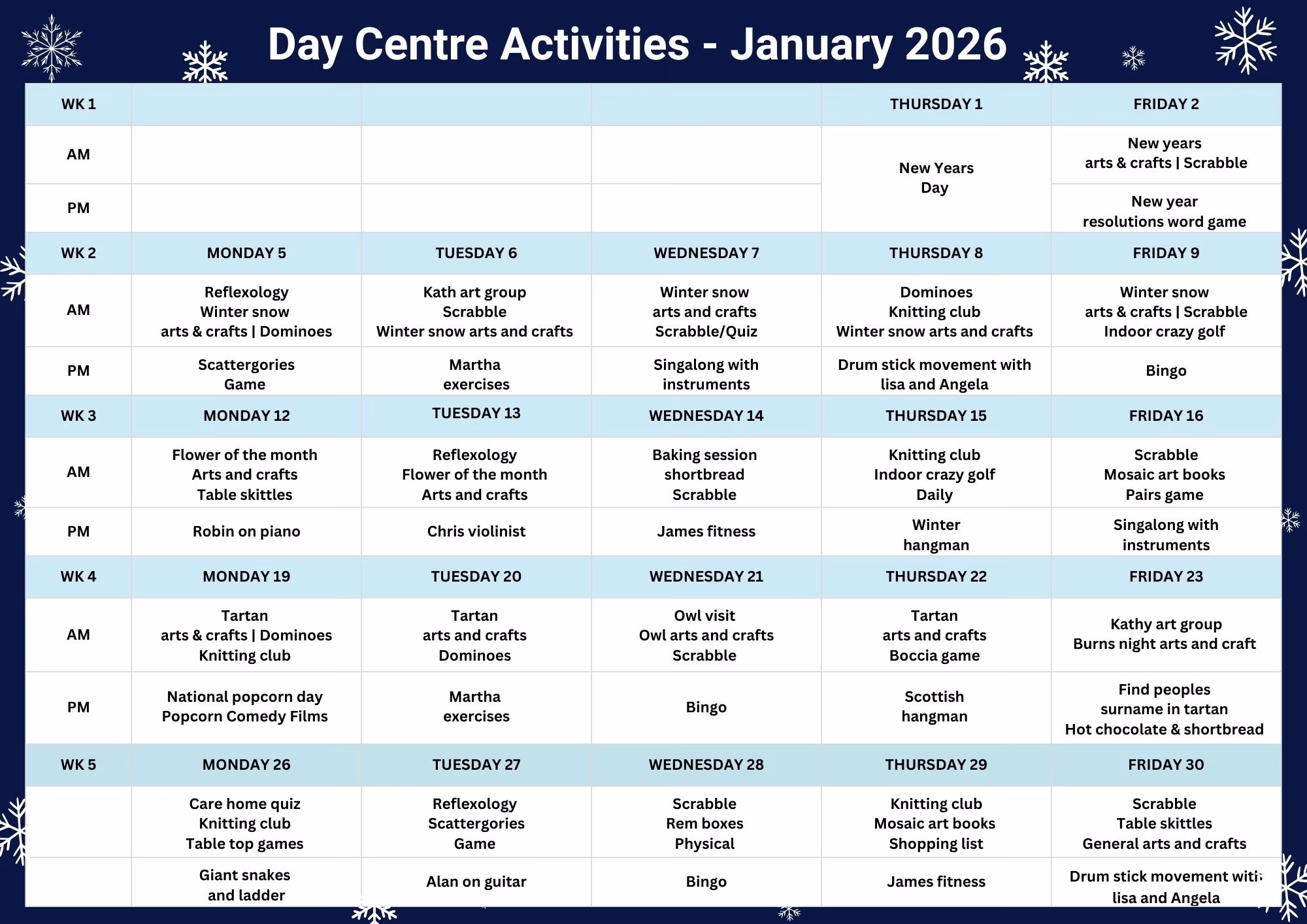 Refreshments are available throughout the day as well as a home-cooked meal at lunchtime and transport is available to collect visitors from their own homes and return them at the end of the day.